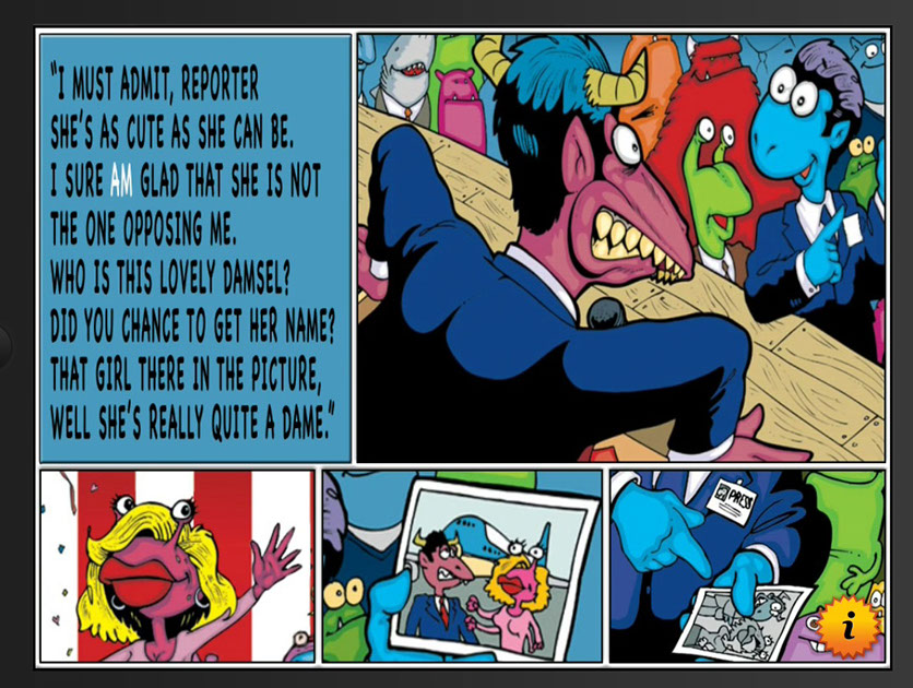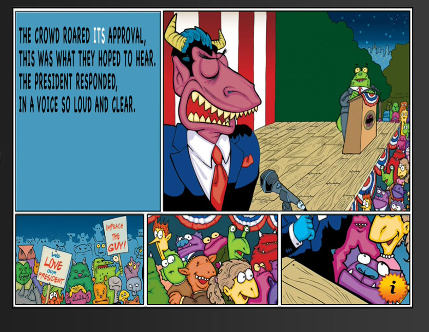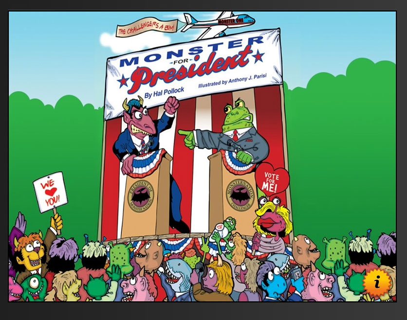 Monster for President is a story that reveals the ups and downs of a political race between rivals for control of Monster Nation. All ages will enjoy this comical political parody following the President and the Challenger along the campaign trail. Watch and read their great debate. A reporter presents some interesting information that might change voter’s opinions. Who will become the next President of Monster Nation? Find out by downloading the app or purchasing the hardcover storybook. Interaction is available throughout the story by tapping on Action areas that play sound when touched.